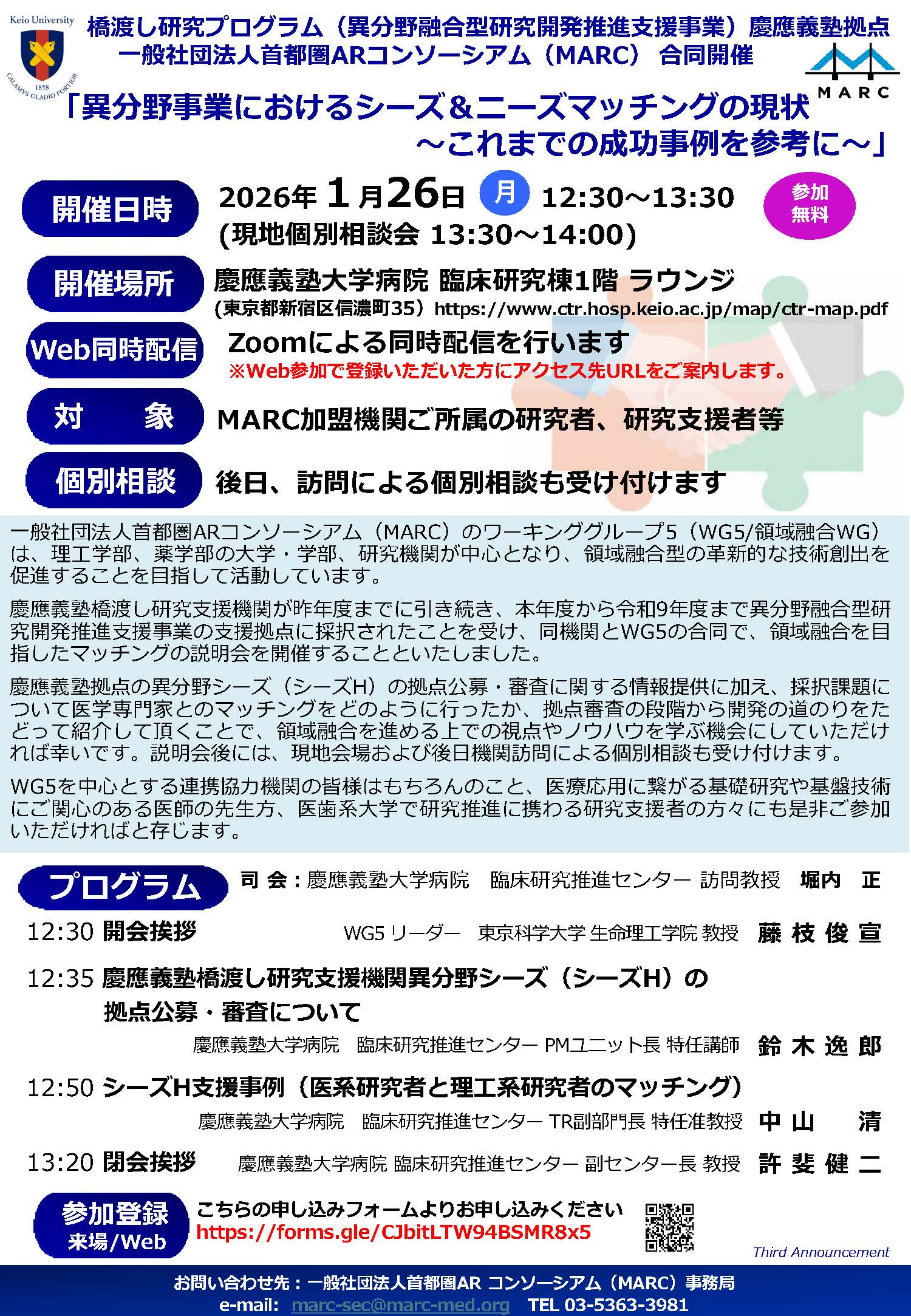 慶應義塾拠点の異分野シーズ(シーズH)の拠点公募・審査に関する情報提供に加え、採択課題について医学専門家とのマッチングをどのように行ったか、拠点審査の段階から開発の道のりをたどって紹介して頂くことで、領域融合を進める上での視点やノウハウを学ぶ機会にしていただければ幸いです。説明会後には、現地会場および後日機関訪問による個別相談も受け付けます。